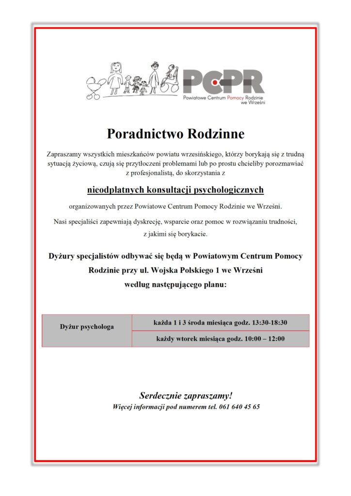 Powiatowe Centrum Pomocy Rodzinie we Wrześni informuje, że mieszkańcy powiatu wrzesińskiego mogą skorzystać z nieodpłatnego poradnictwa psychologicznego.